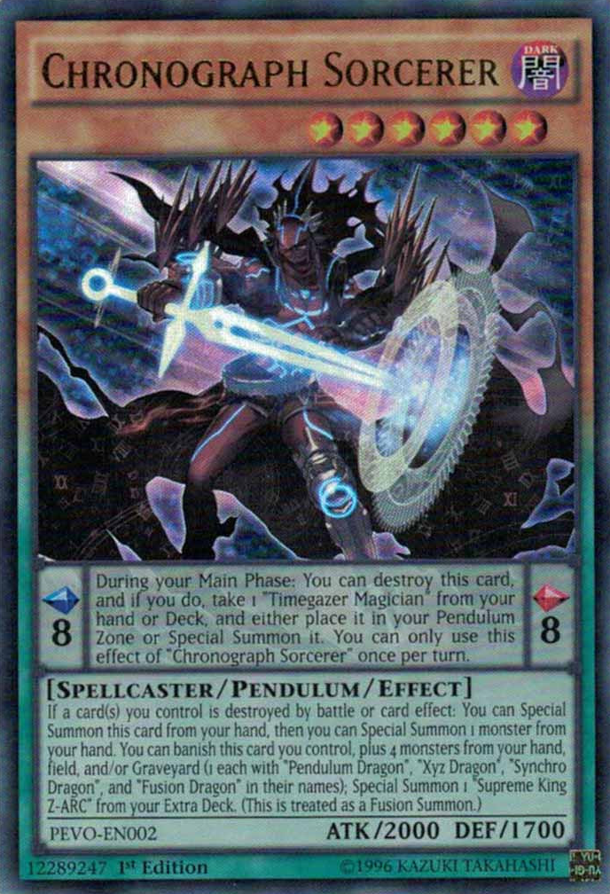 Pendulum Effect : During your Main Phase: You can destroy this card, and if you do, take 1 "Timegazer Magician" from your hand or Deck, and either place it in your Pendulum Zone or Special Summon it. You can only use this effect of "Chronograph Sorcerer" once per turn.