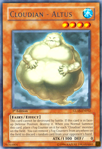 This card cannot be destroyed by battle. If this card is in face-up Defense Position, destroy it. When you Normal Summon this card, place 1 Fog Counter on it for each "Cloudian" monster on the field. You can remove 3 Fog Counters from anywhere on the field to discard 1 random card from your opponent's hand.