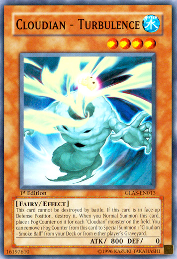 This card cannot be destroyed in battle. If this card is in face-up Defense Position, destroy it. When you Normal Summon this card, place 1 Fog Counter on it for each "Cloudian" monster on the field. You can remove 1 Fog Counter from this card to Special Summon 1 "Cloudian - Smoke Ball" from your Deck or either player's Graveyard.