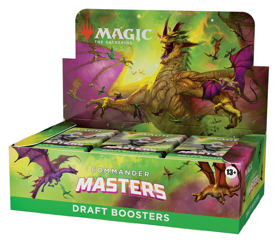 La caja de sobres de Draft de Commander Masters contiene 24 sobres de Draft de Commander Masters. Cada sobre de Draft contiene 20 cartas y 1 ficha de dos caras, e incluye entre 2 y 4 cartas raras o de una rareza superior (3: 36 %; 4: 3 %), entre 5 y 7 poco comunes y entre 11 y 12 comunes. Hay 1 carta rara mítica sin borde foil tradicional en menos del 1 % de los sobres.